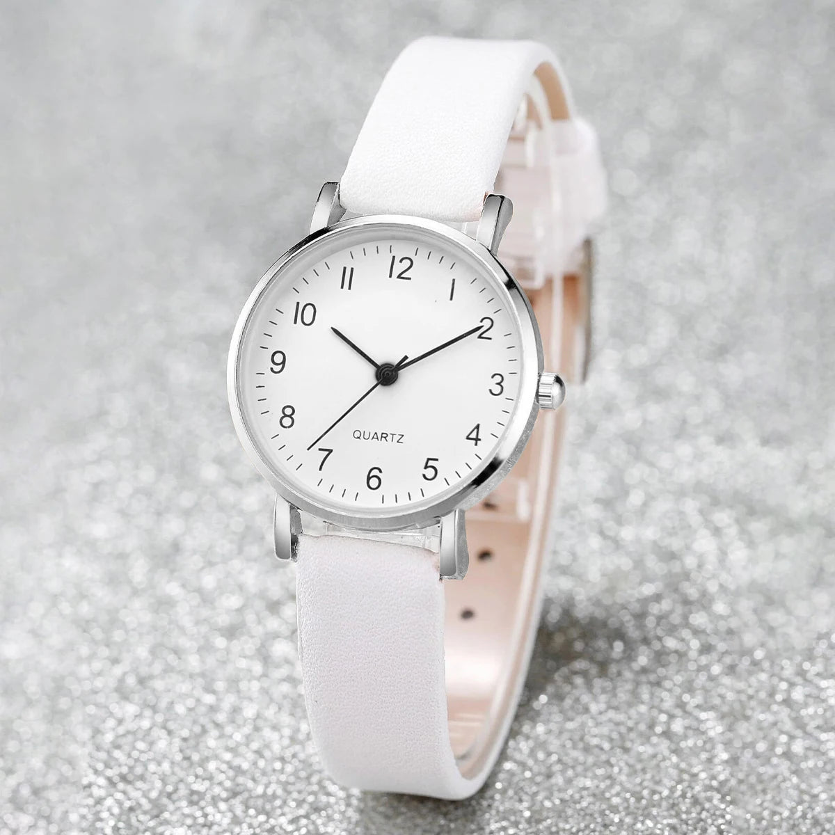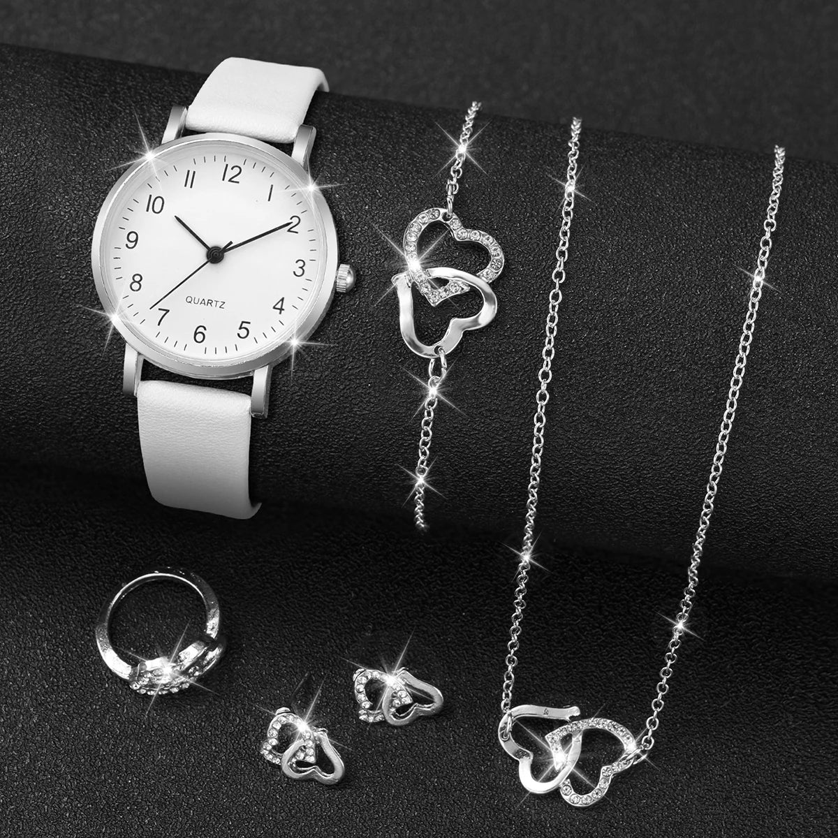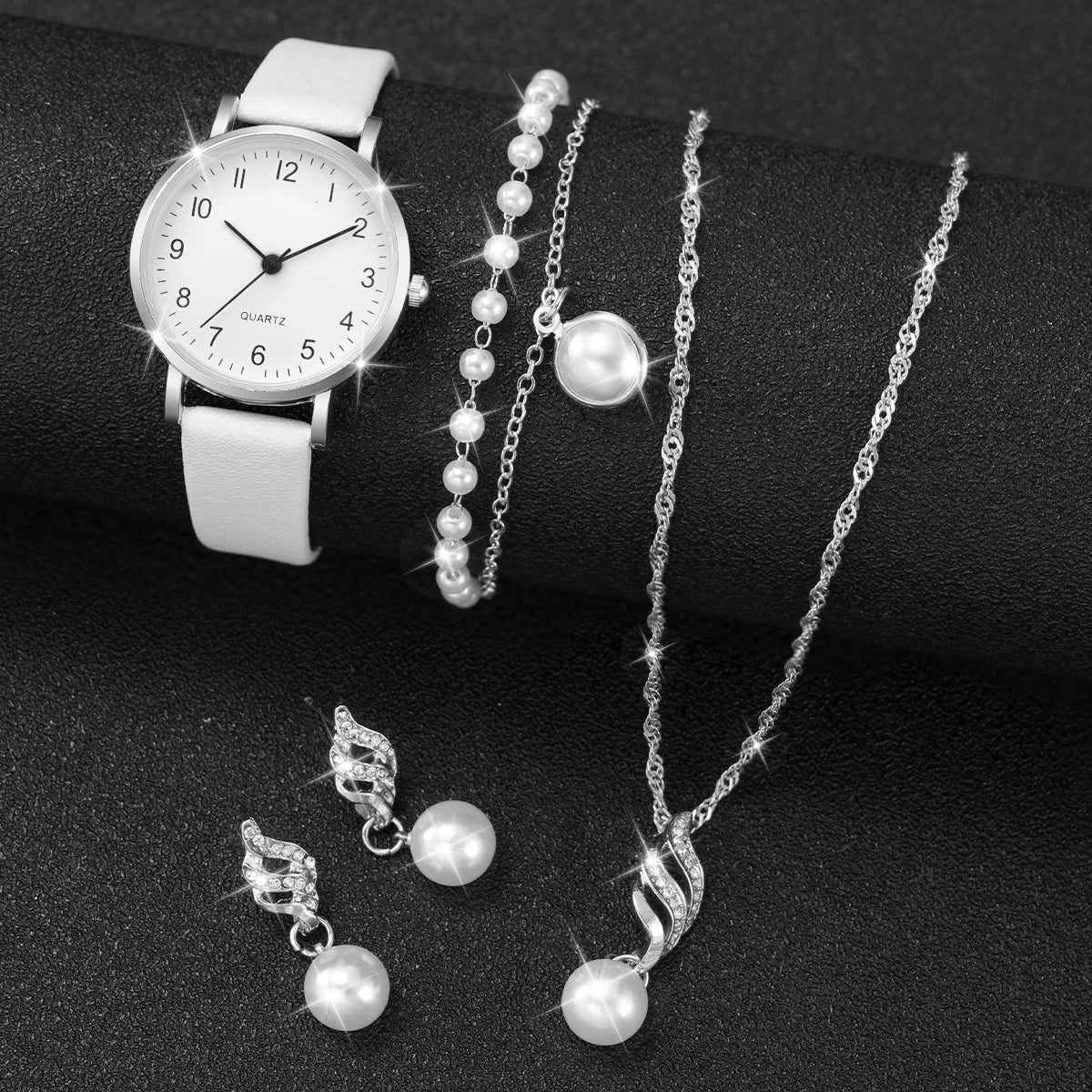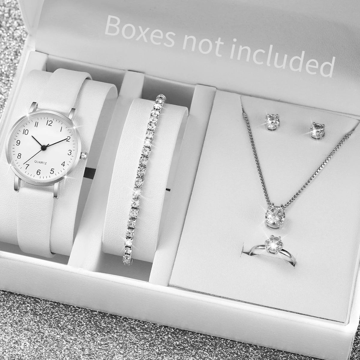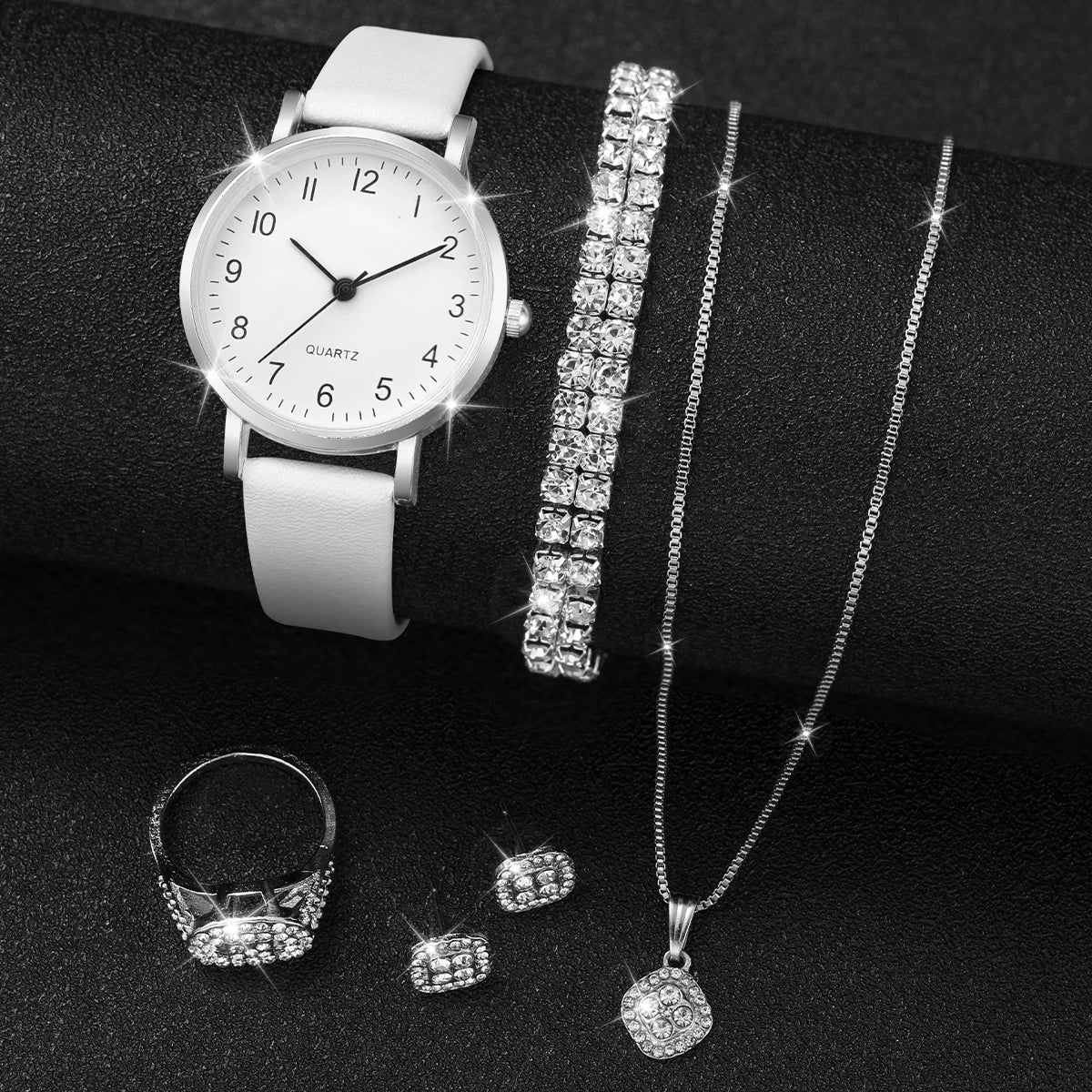 أنيقة وعصرية، طقم ساعات كوارتز نسائي من 5/6 قطع، بسوار جلدي وساعات كوارتز تناظرية ومجوهرات ألماس. طقم مثالي بدون علبة.