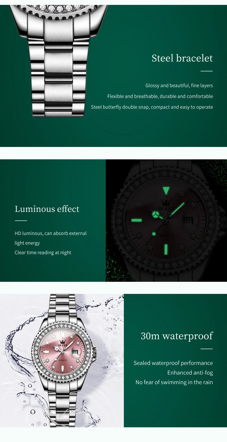 ساعة OLEVS 9945 النسائية - ساعة فاخرة من الفولاذ بتقويم ألماسي
