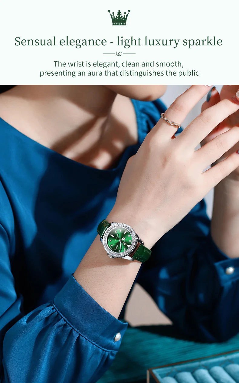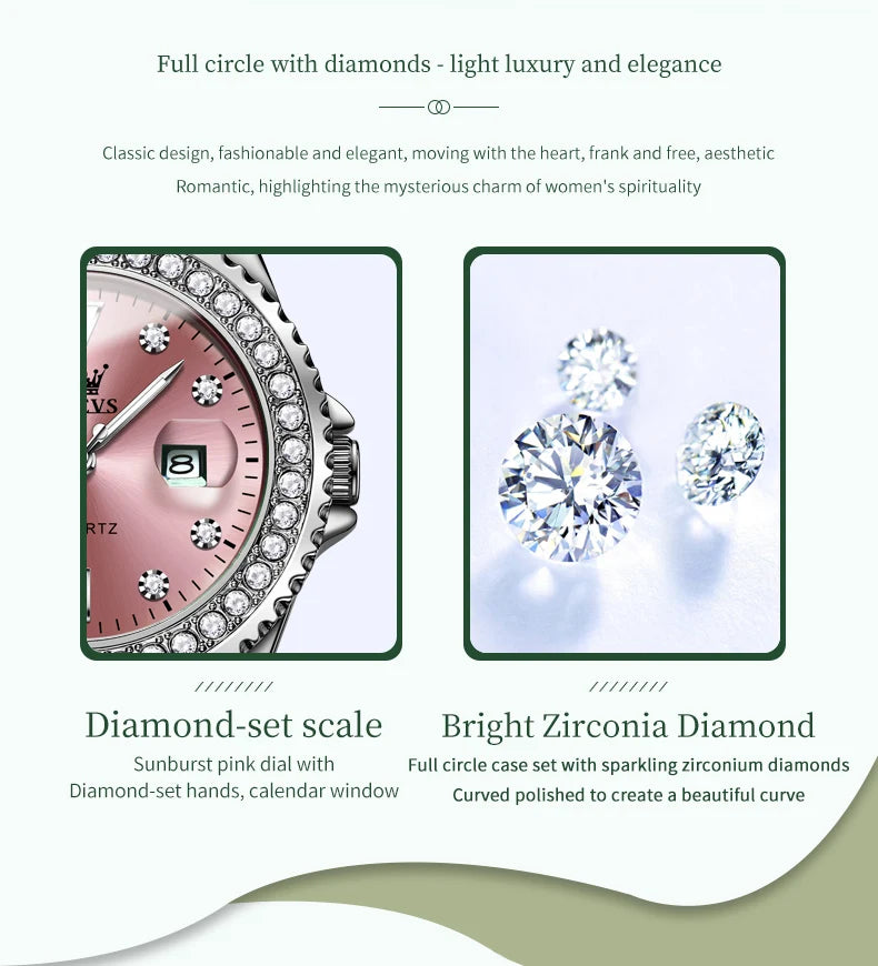 ساعة OLEVS 9945 كوارتز أصلية وعالية الجودة، تتميز بتقويم دائري فاخر مرصع بالألماس، وهيكل من الفولاذ المقاوم للصدأ. ساعة يد مثالية للسيدات.