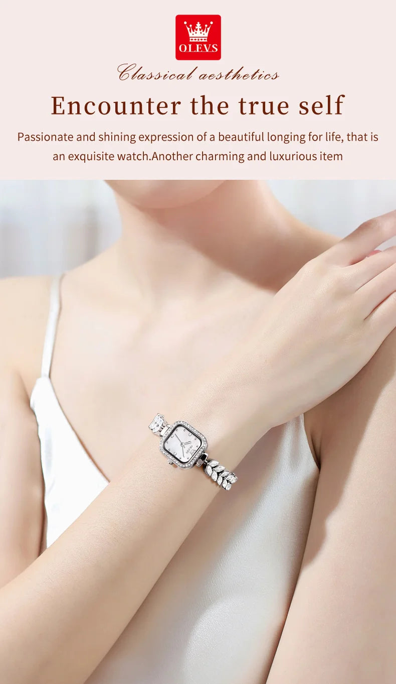 تتميز ساعة OLEVS 9987 الكوارتز المقاومة للماء ذات الميناء المربع الفاخرة والأصلية بساعة يد نسائية أنيقة مع حزام من الفولاذ.