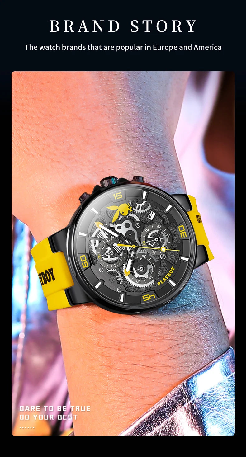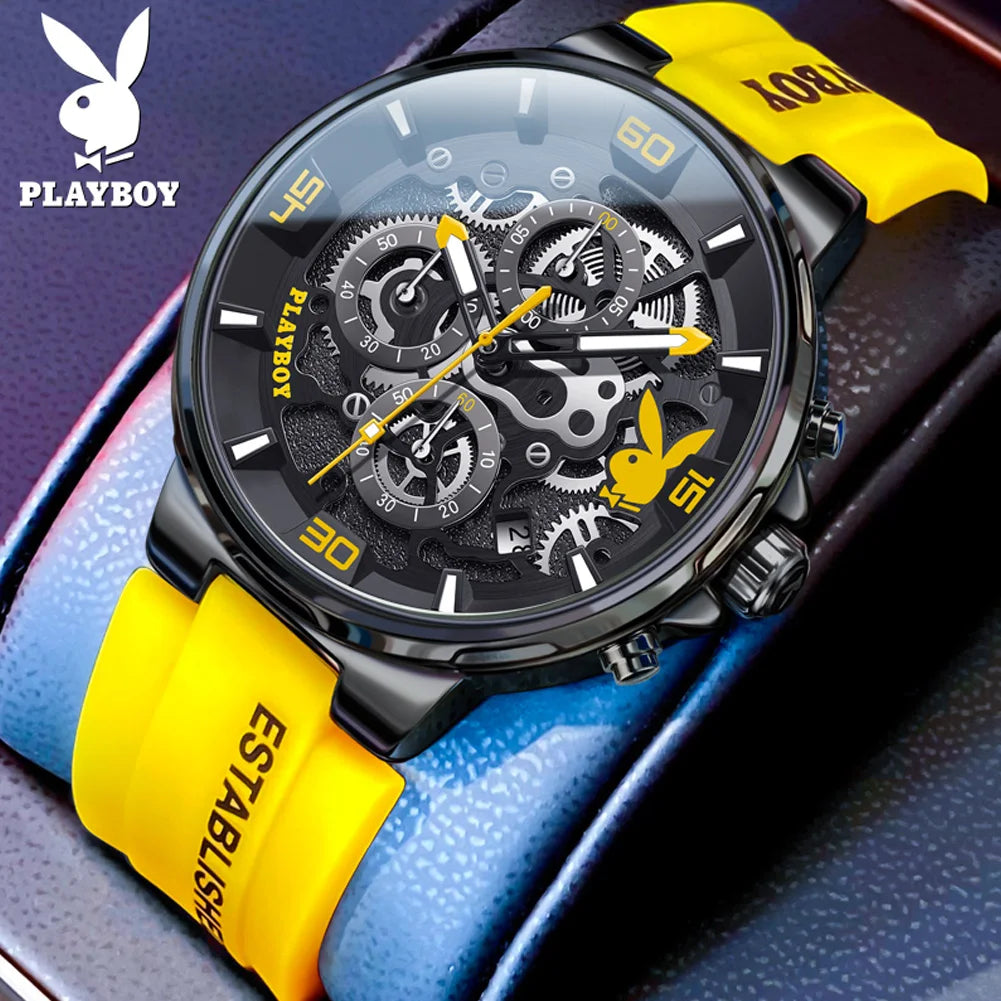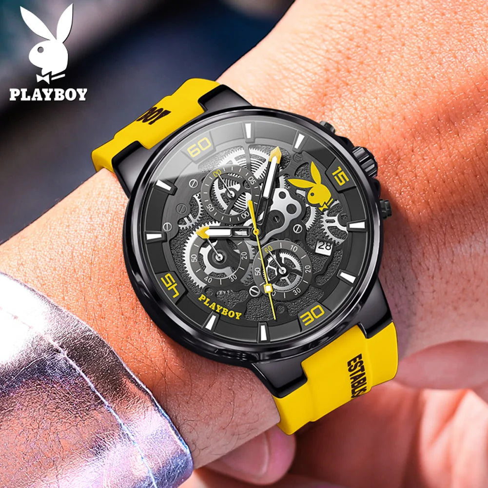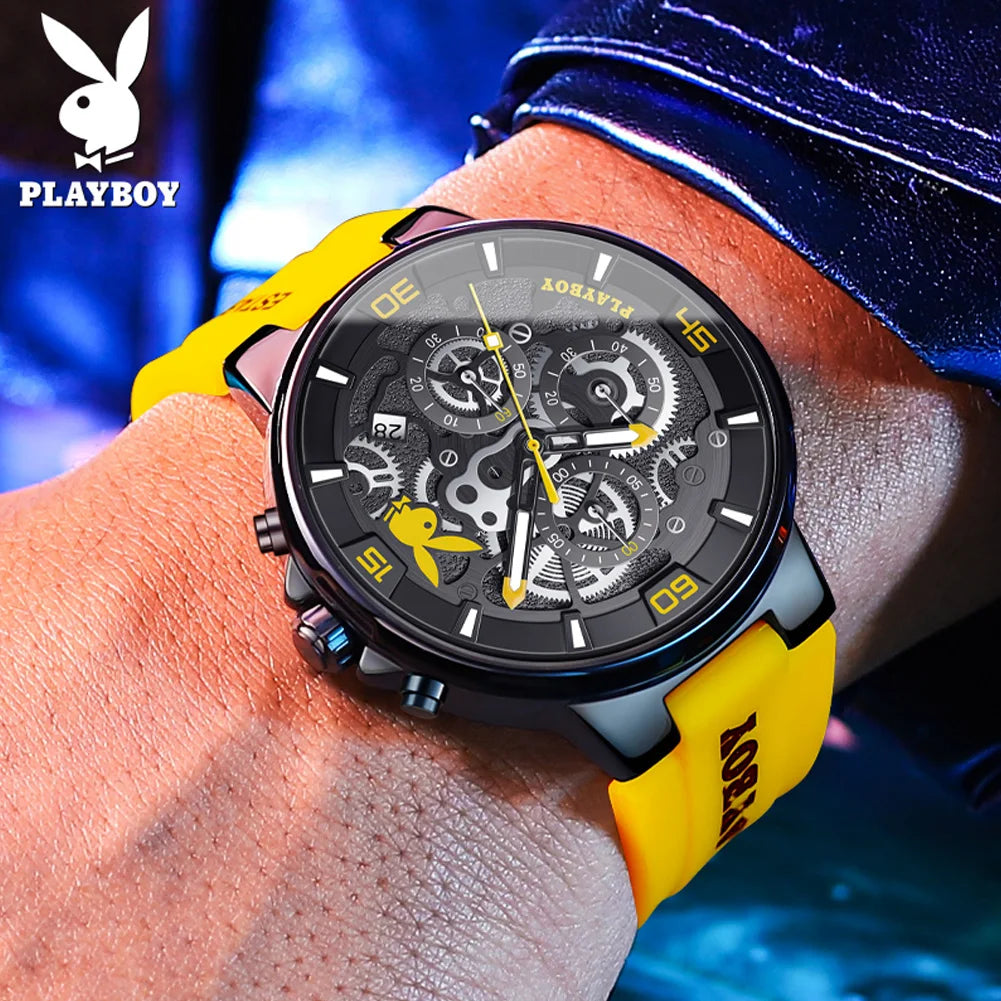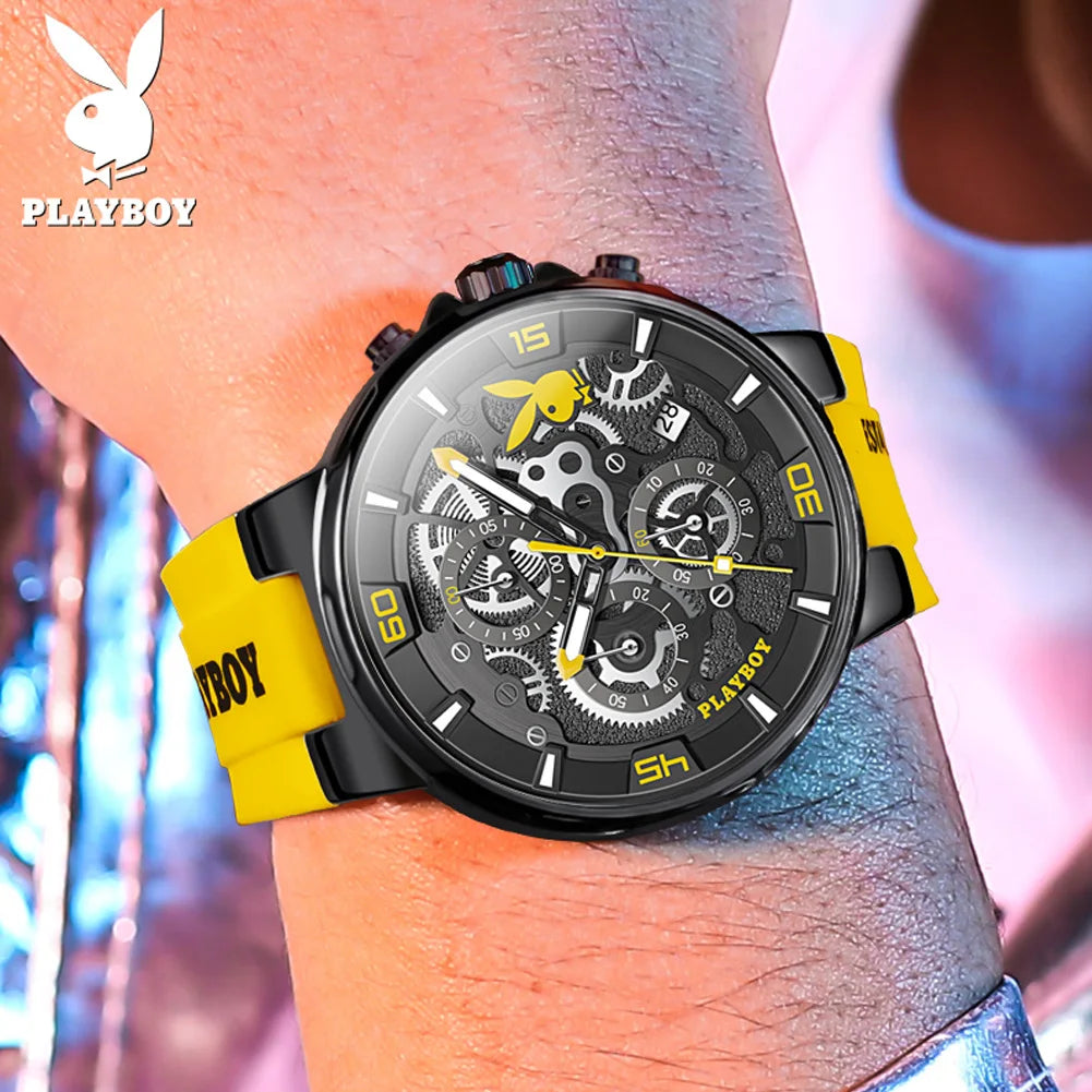 ساعة بلاي بوي الأصلية الفاخرة للرجال بحزام من السيليكون وساعة كوارتز أنيقة للرجال مقاومة للماء وساعة رياضية مضيئة للرجال