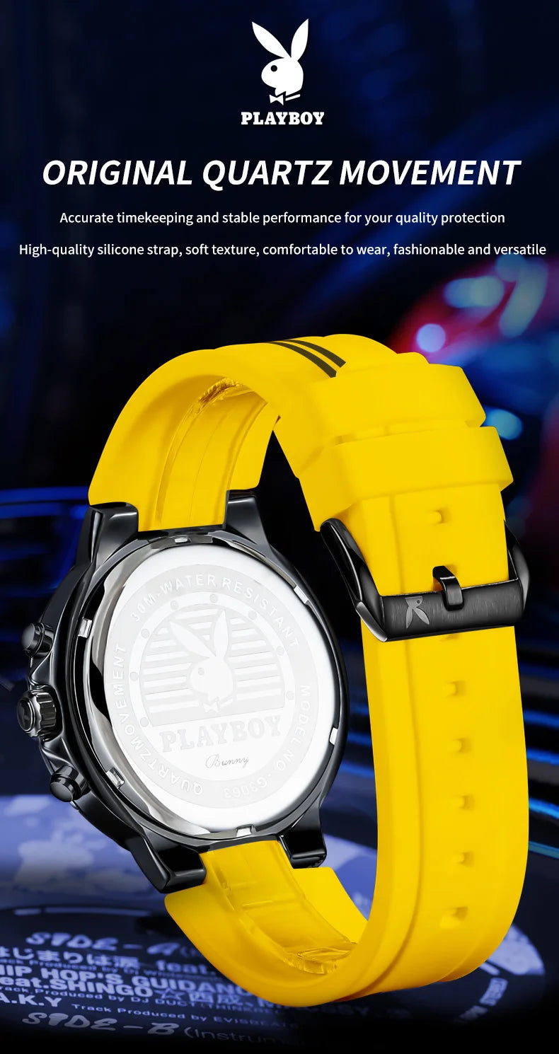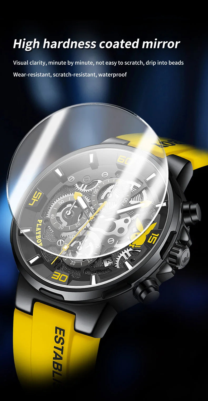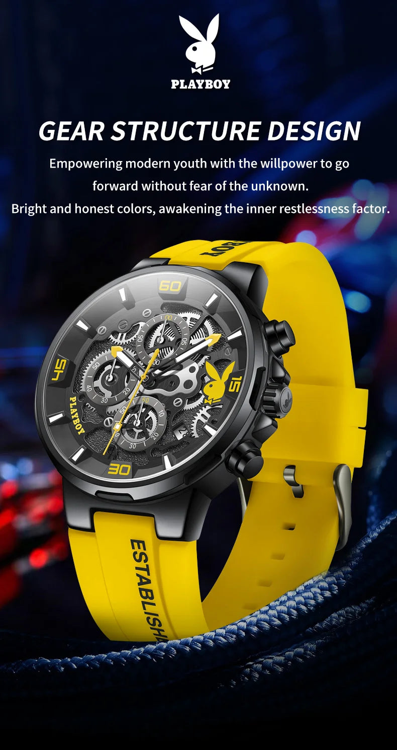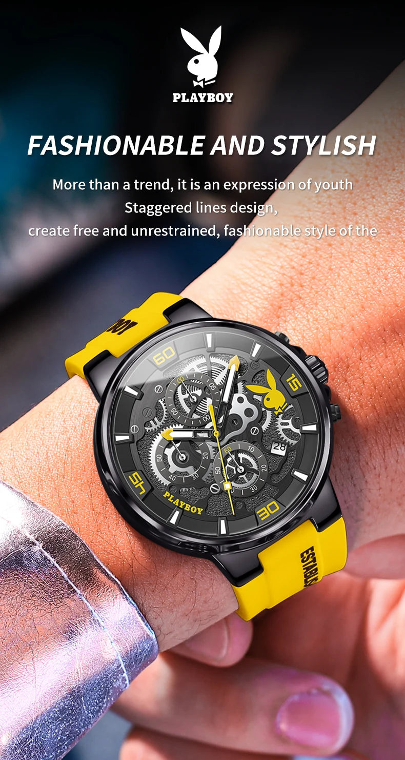 ساعة بلاي بوي الأصلية الفاخرة للرجال بحزام من السيليكون وساعة كوارتز أنيقة للرجال مقاومة للماء وساعة رياضية مضيئة للرجال
