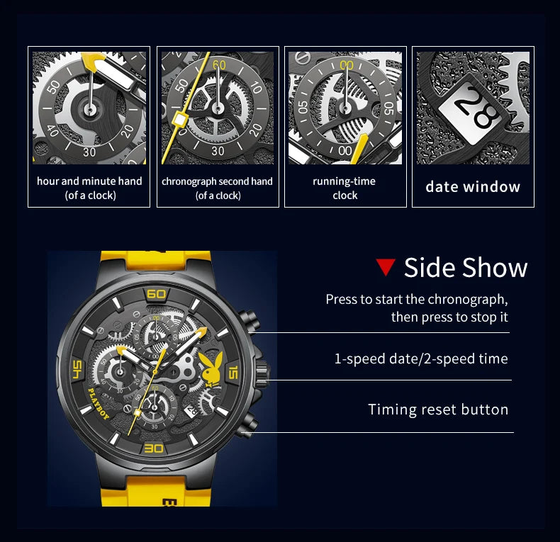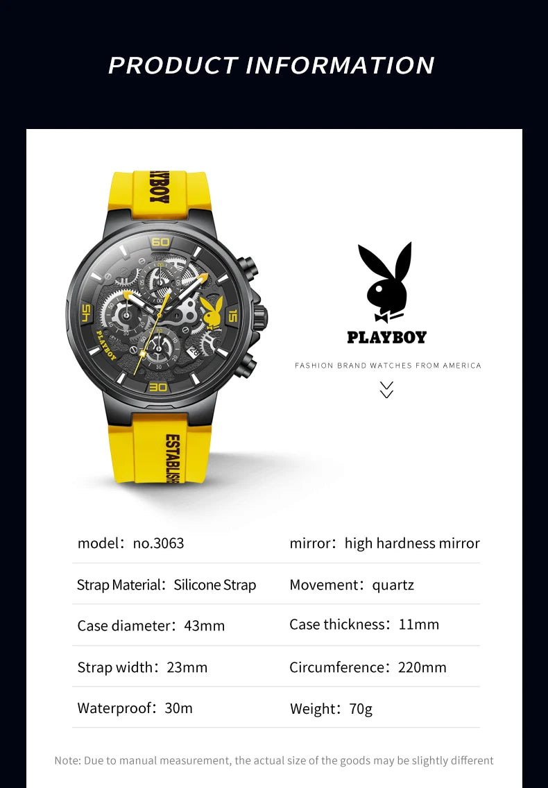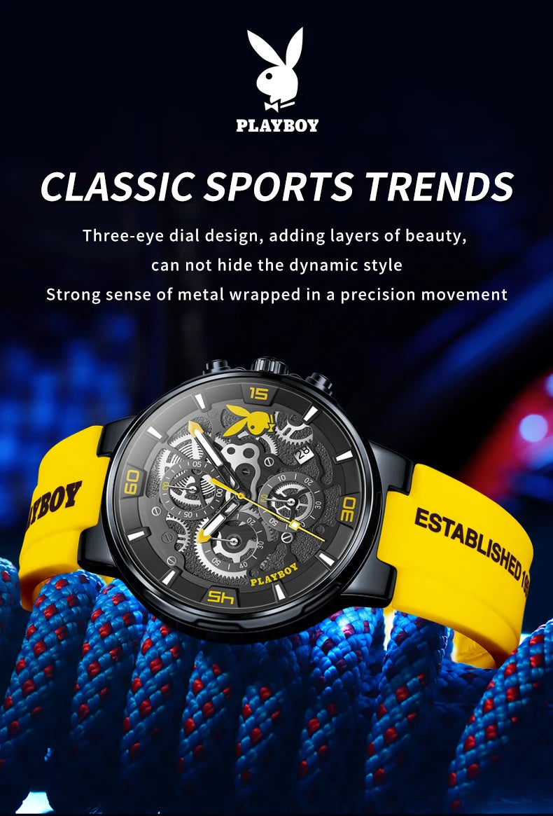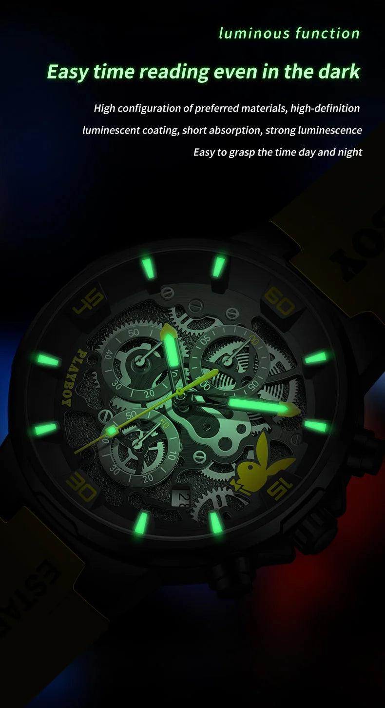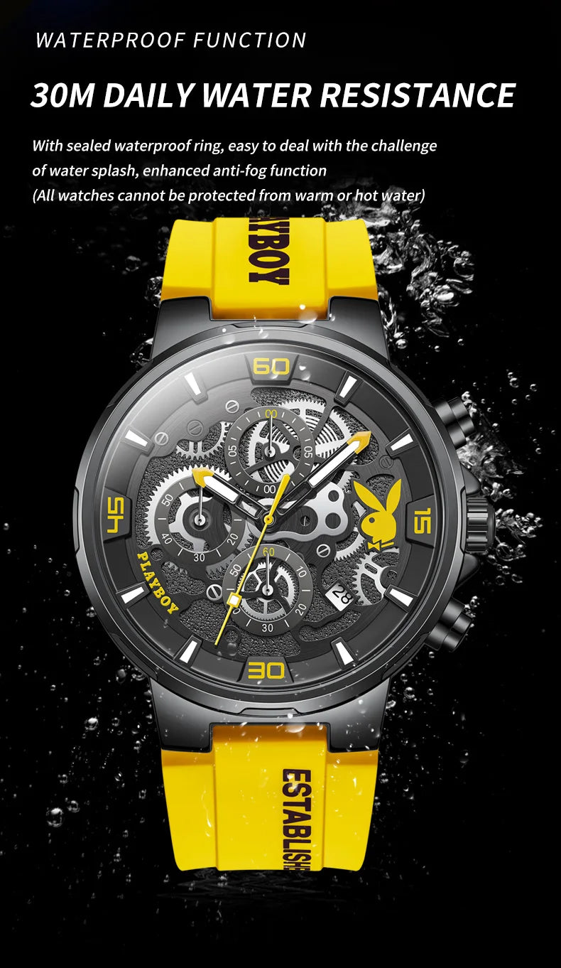 ساعة بلاي بوي الأصلية الفاخرة للرجال بحزام من السيليكون وساعة كوارتز أنيقة للرجال مقاومة للماء وساعة رياضية مضيئة للرجال