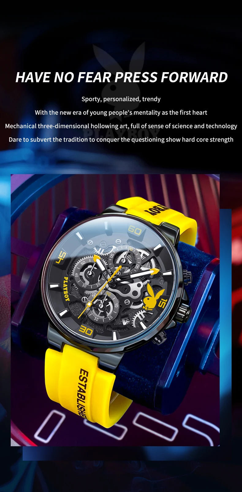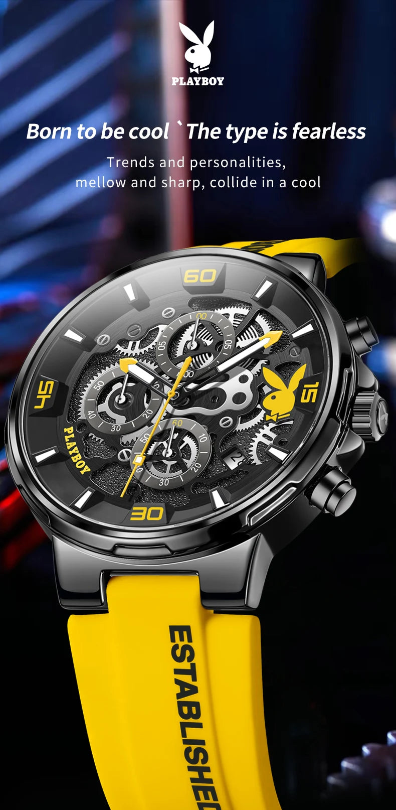 ساعة بلاي بوي فاخرة وأصلية، تتميز بحزام سيليكون، وتصميم كوارتز عصري، وهيكل مضيء مقاوم للماء، وأسلوب رياضي. ساعة مثالية للرجال.