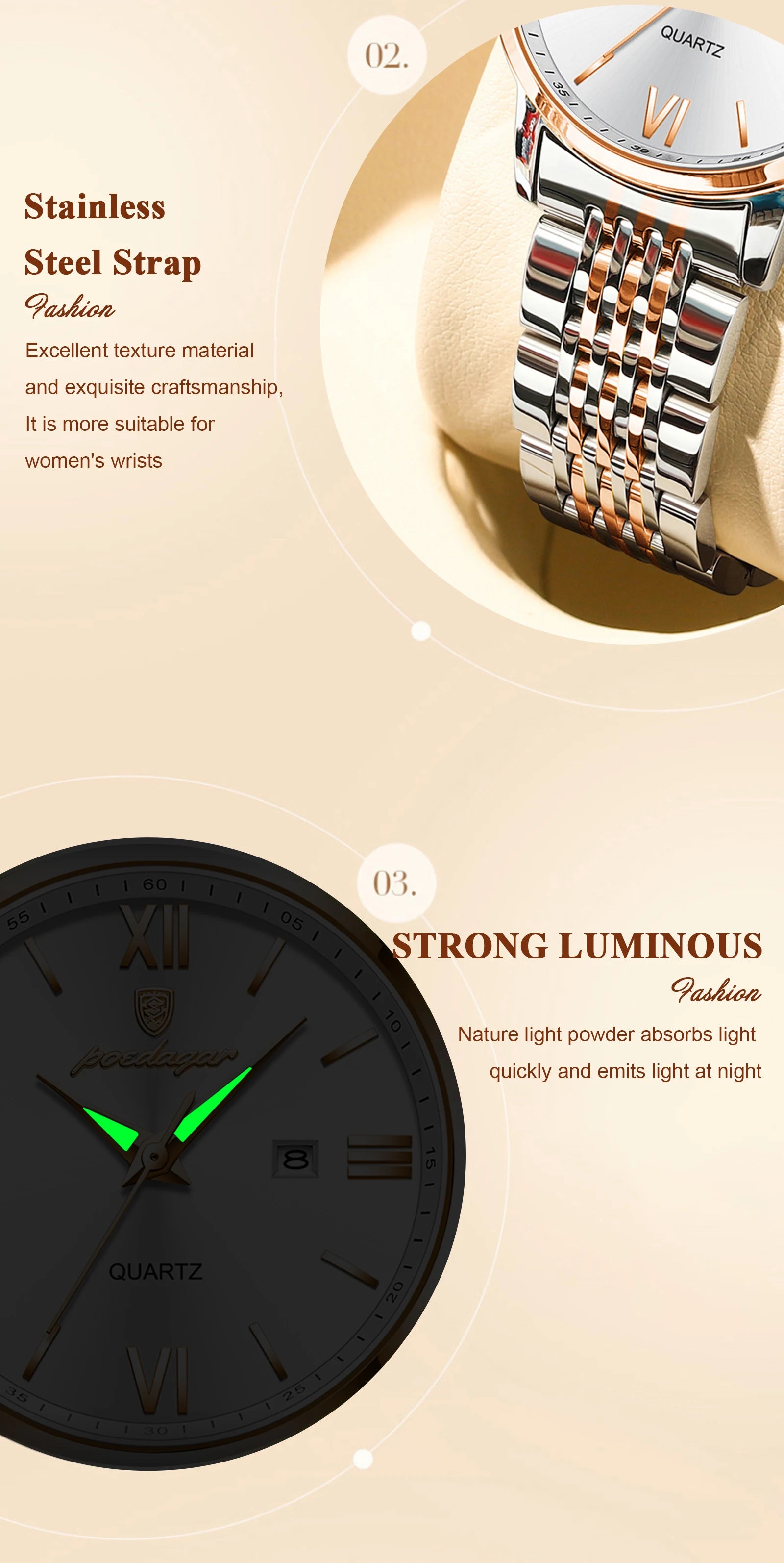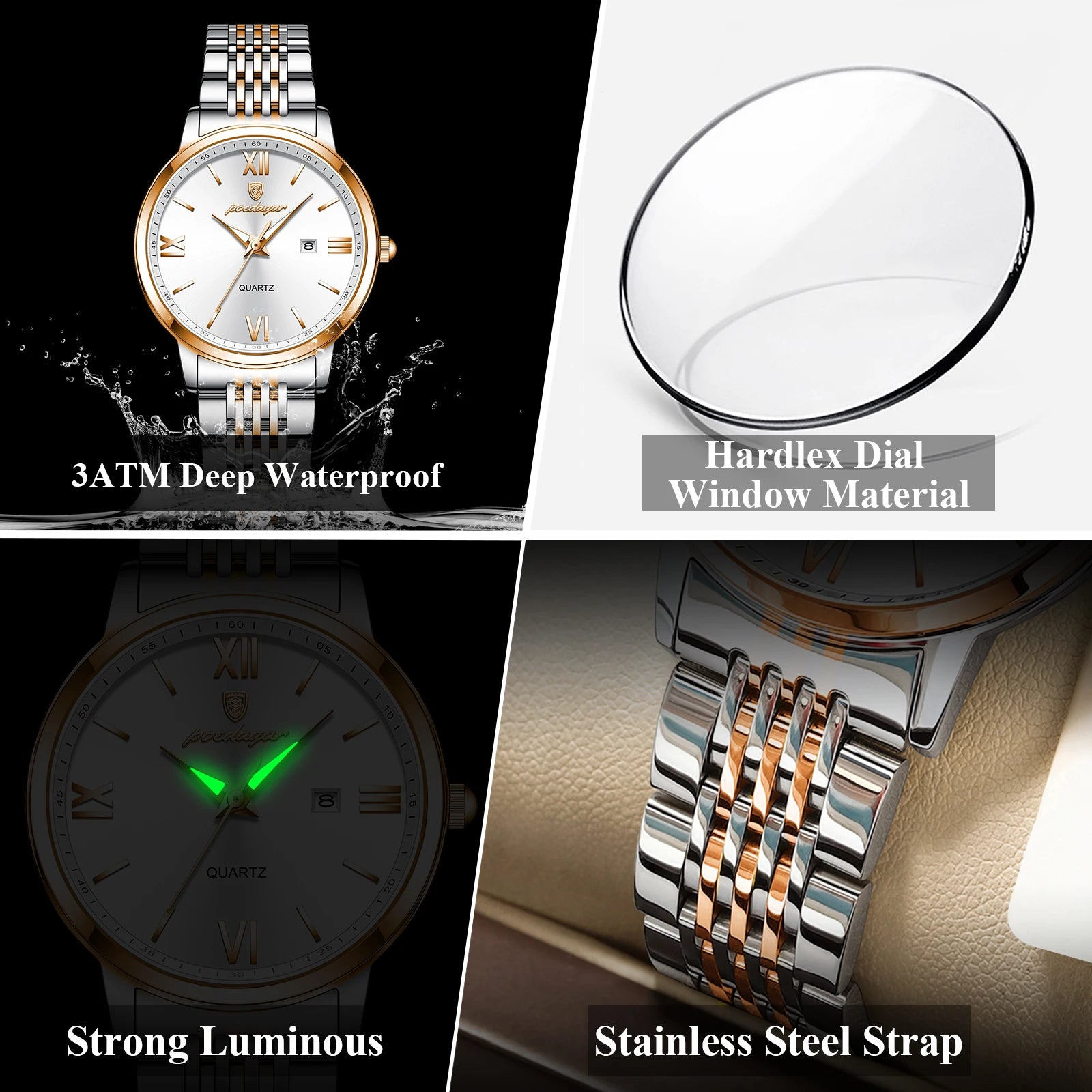 ساعة POEDAGAR النسائية - ساعة فولاذية فاخرة مقاومة للماء ومضيئة