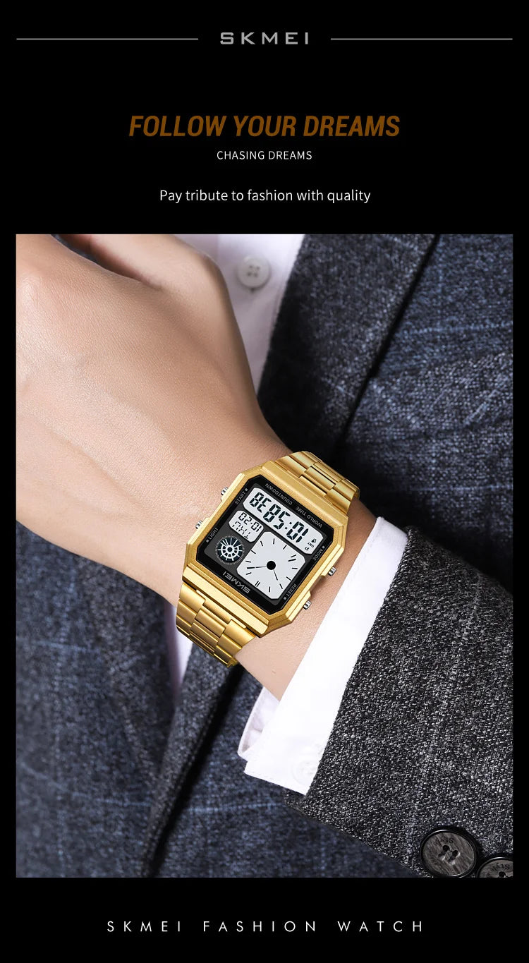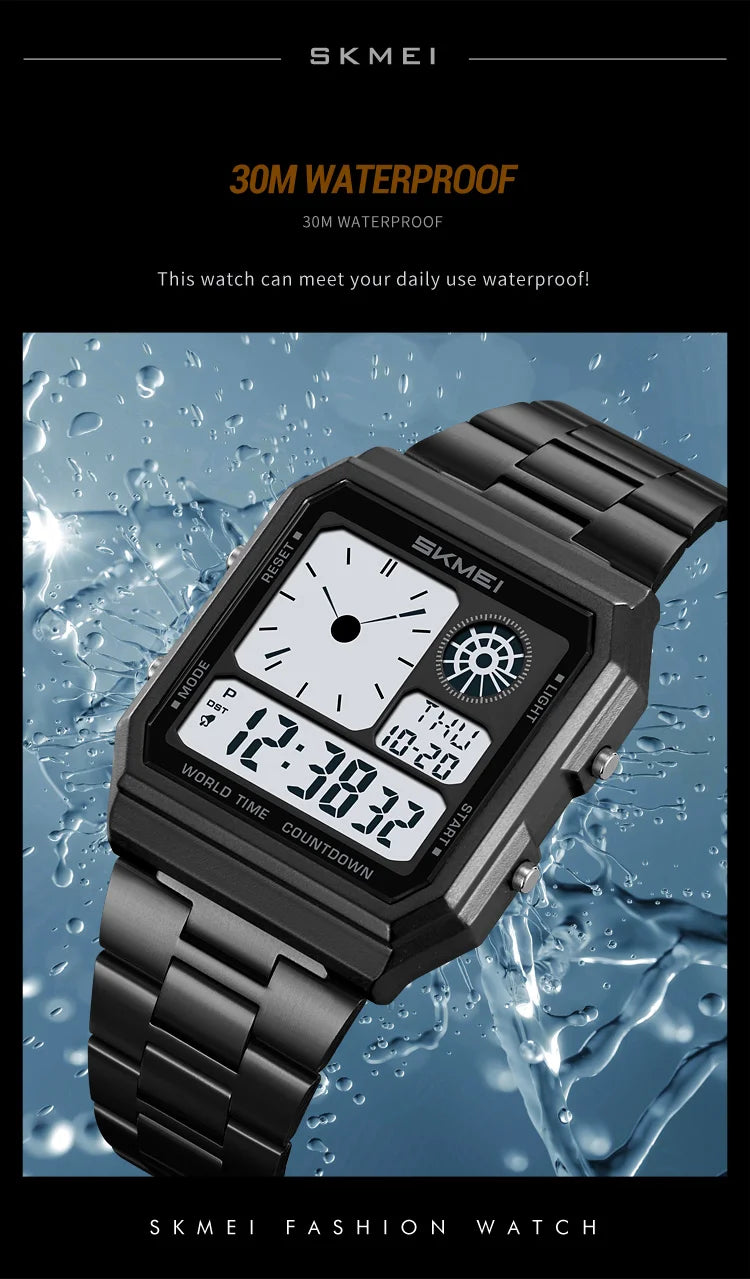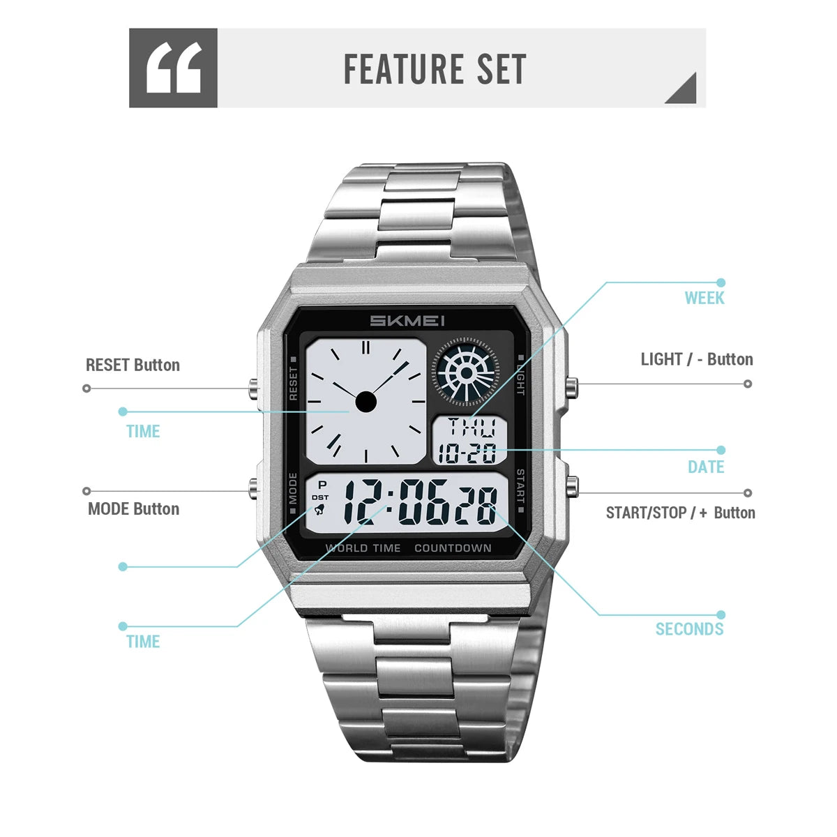 ساعة سكيمي الإلكترونية الرقمية متعددة الاستخدامات ومتينة، بتصميم رياضي خارجي مقاوم للماء وسوار من الفولاذ المقاوم للصدأ. ساعة يد مثالية للرجال والنساء.