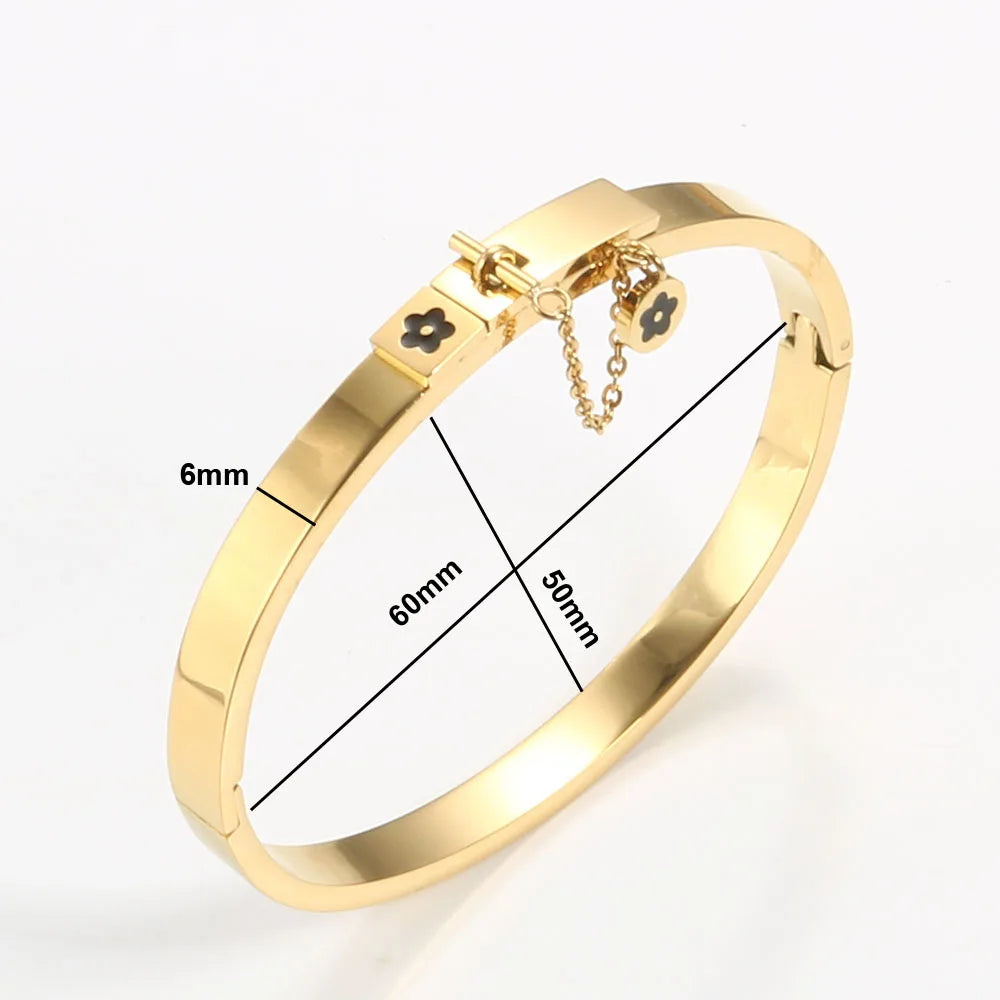 Complete your look with this stunning stainless steel jewelry set featuring a golden bangle bracelet and matching flower charm finger ring. Perfect for gifting or treating yourself.